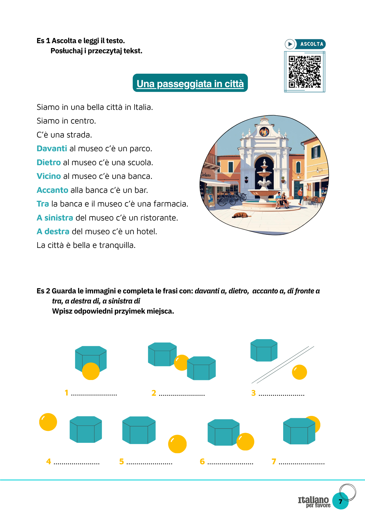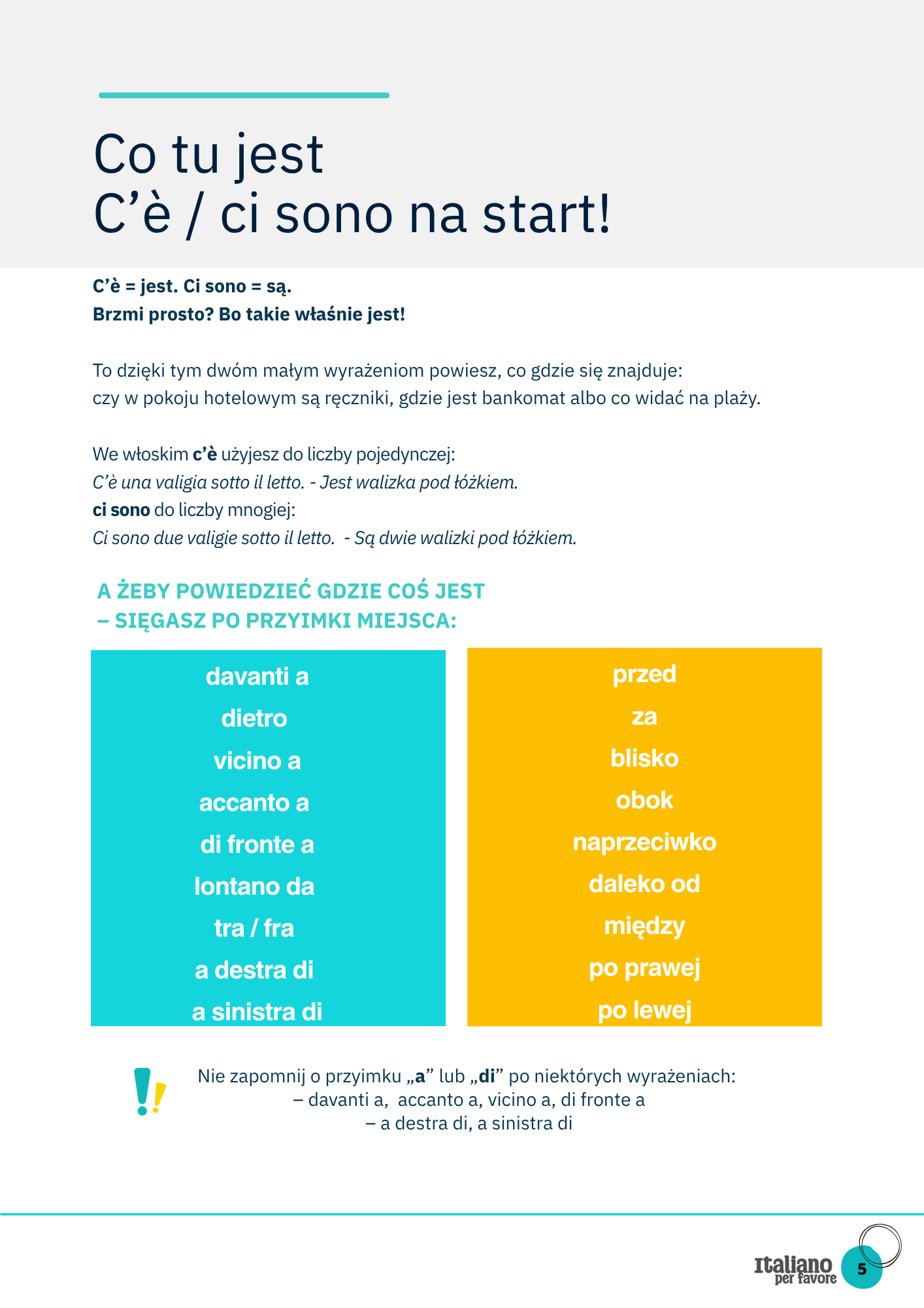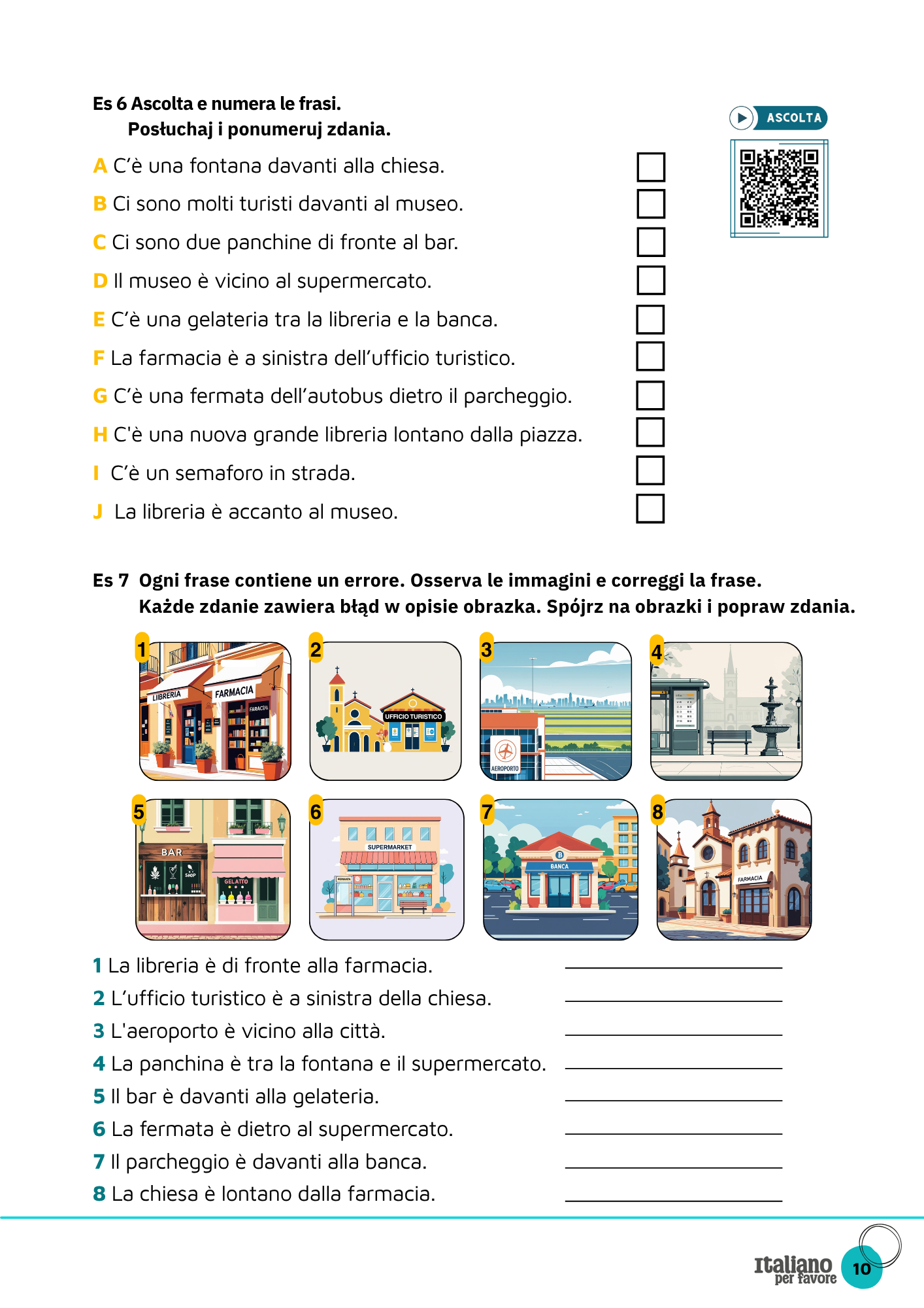 Ten workbook nauczy Cię w praktyce korzystać z c’è / ci sono oraz najważniejszych przyimków miejsca, dzięki którym bez problemu powiesz, co gdzie się znajduje — na mieście, w hotelu, w muzeum czy na plaży.
