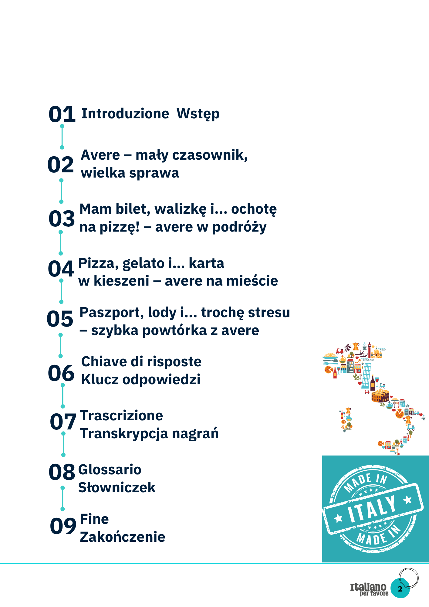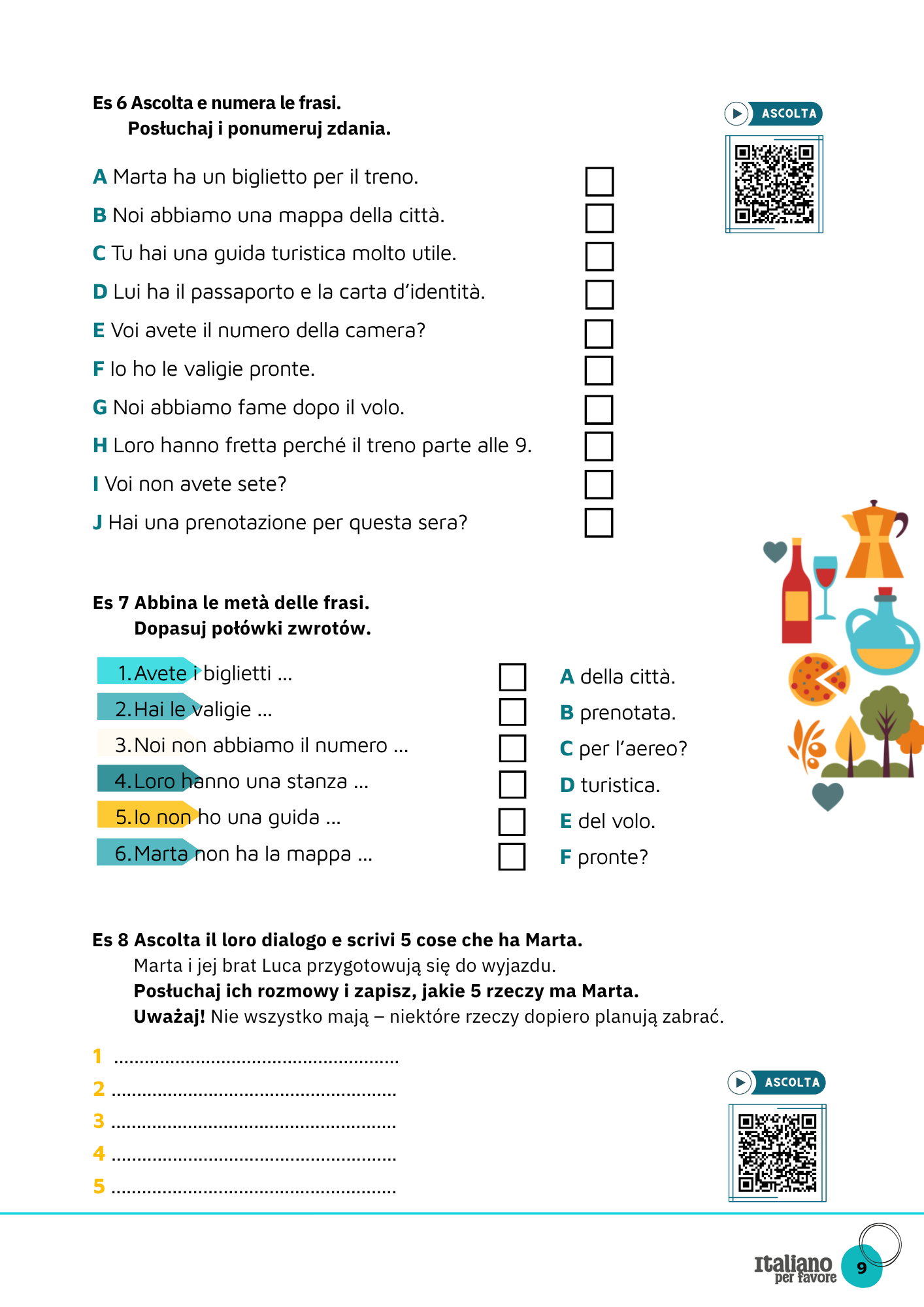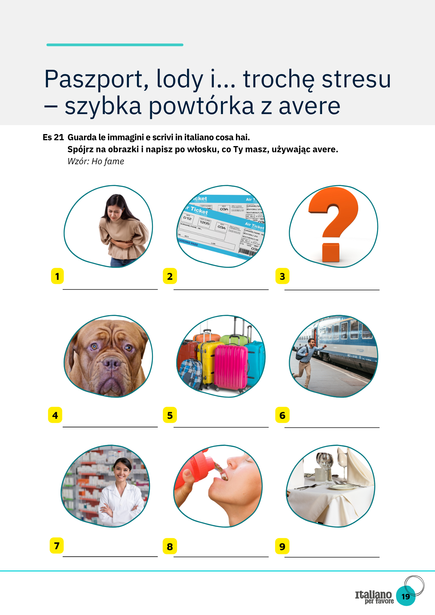 W tym workbooku poznasz odmianę avere i przećwiczysz ponad 20 praktycznych sytuacji, które naprawdę zdarzają się na wyjeździe — w hotelu, na lotnisku, w restauracji, w pociągu i na mieście.