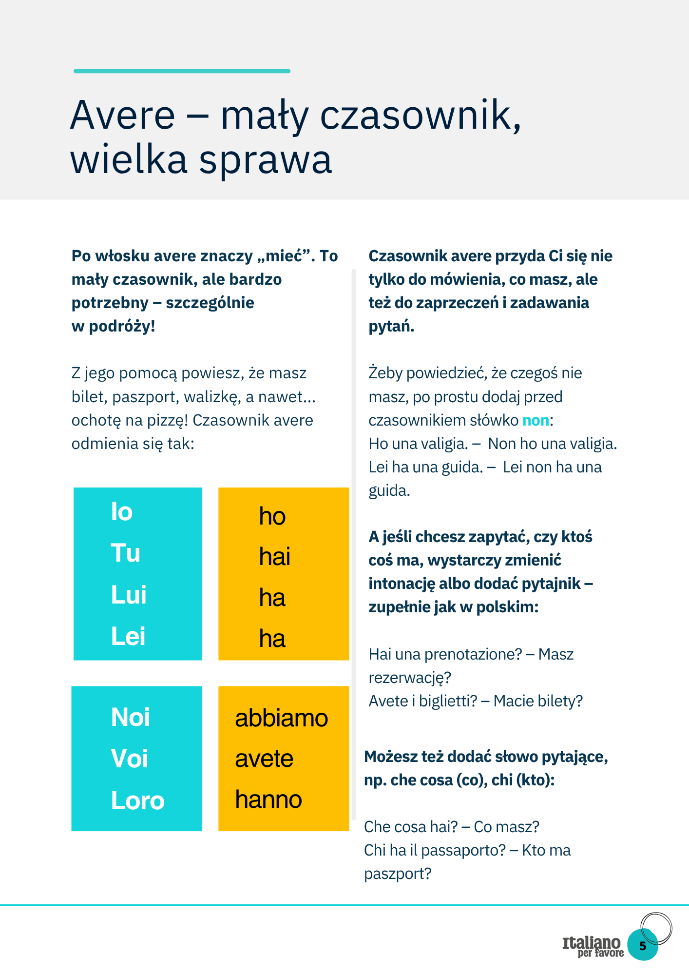 ✔ opanujesz ważny i bardzo częsty czasownik avere — na 100% praktycznie