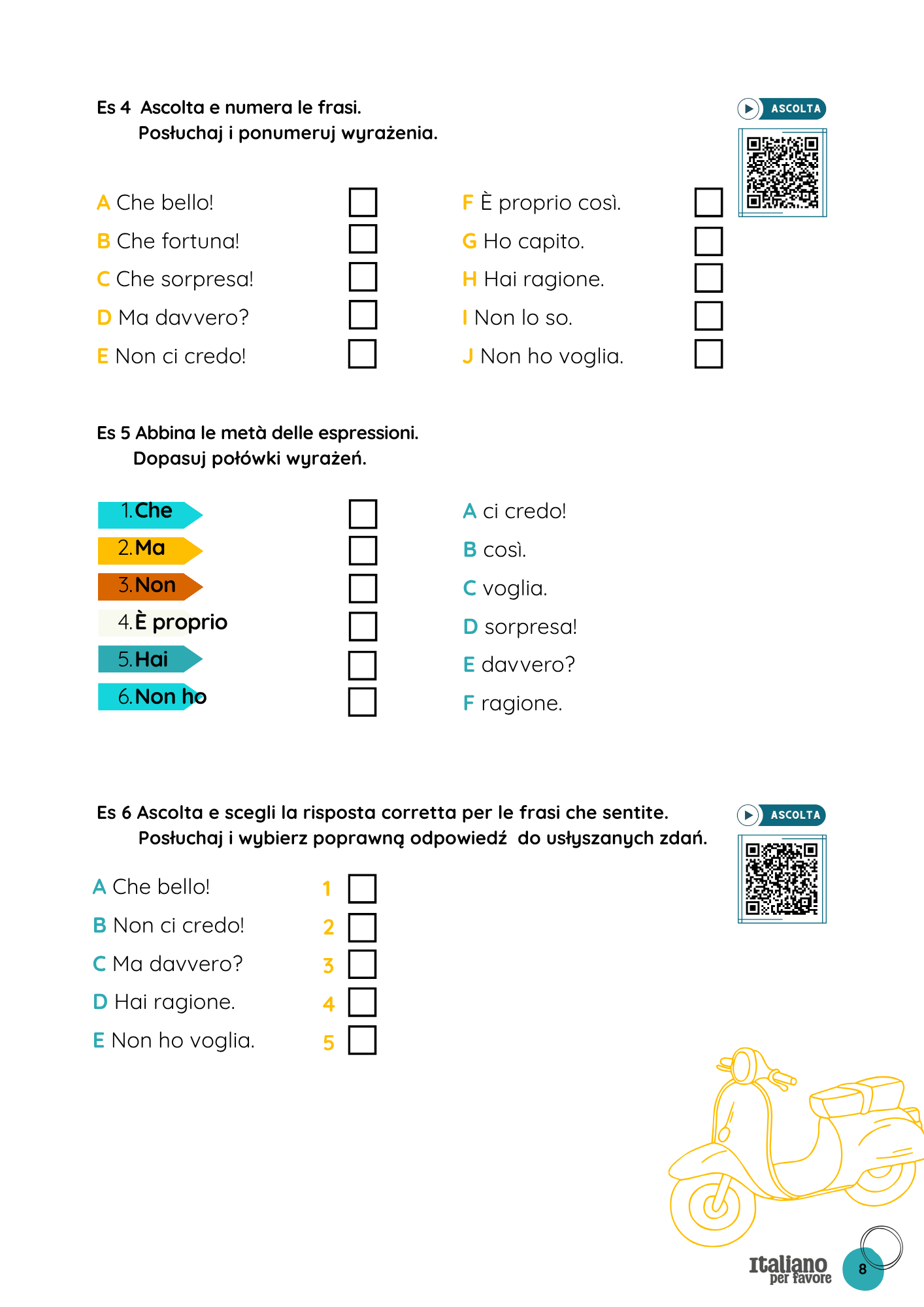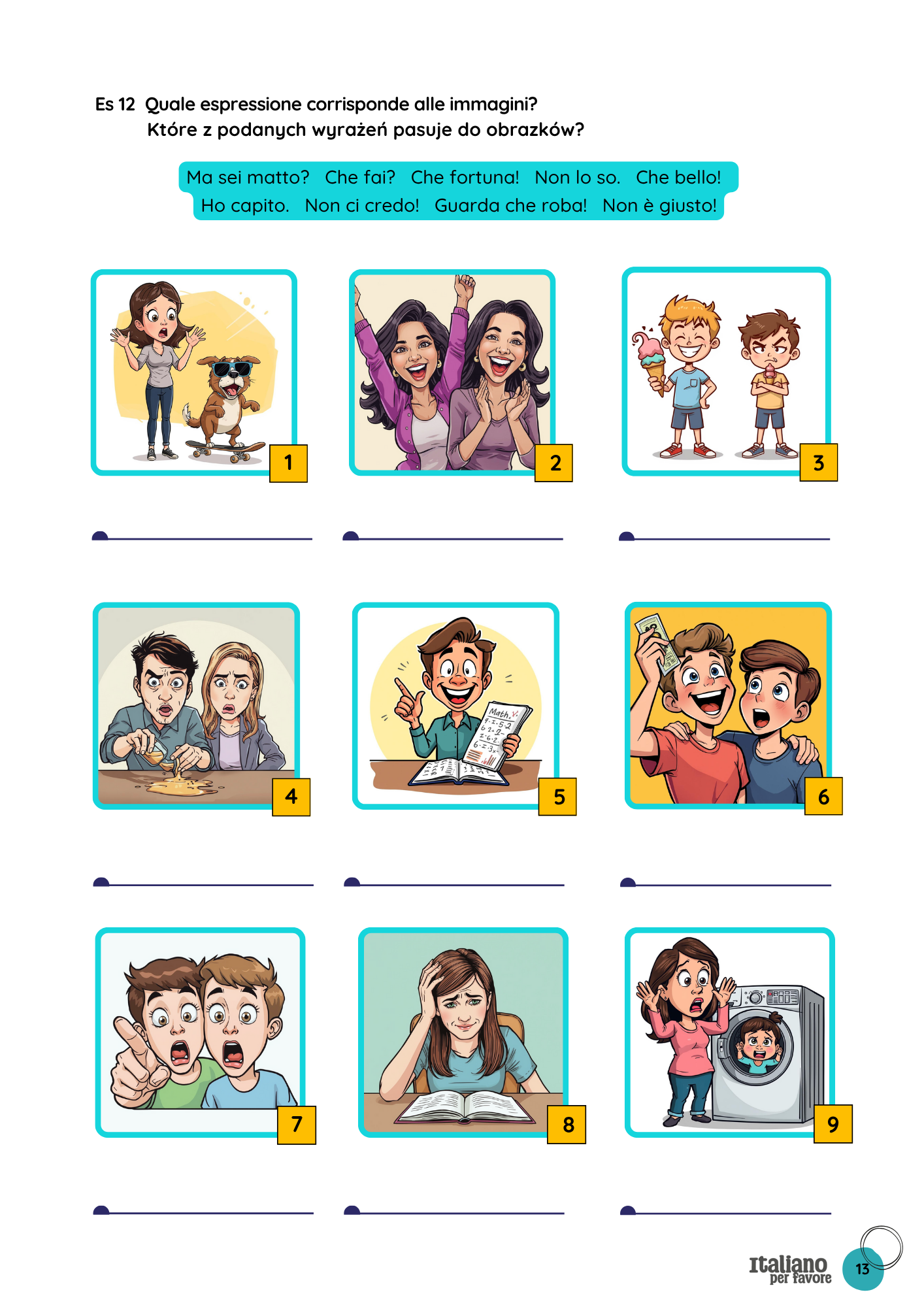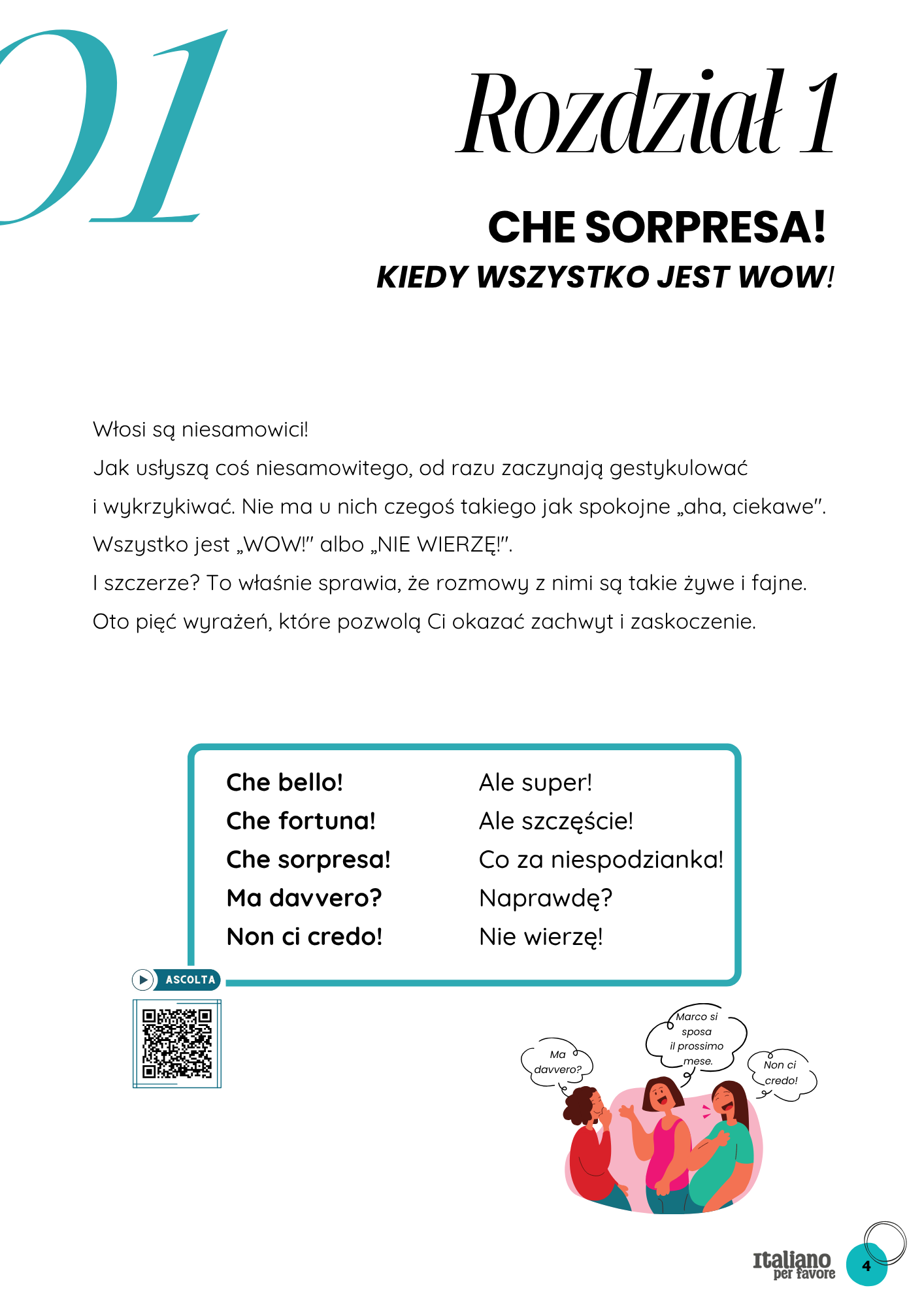 Ten workbook pomoże Ci szybciej i swobodniej reagować po włosku w prawdziwych sytuacjach. Zebrane tu krótkie i bardzo częste włoskie wyrażenia — od „Ale super!” po „Nie mam ochoty.” — pozwolą Ci naturalnie odpowiadać, dopytywać i wyrażać emocje, zupełnie jak robią to Włosi na co dzień.