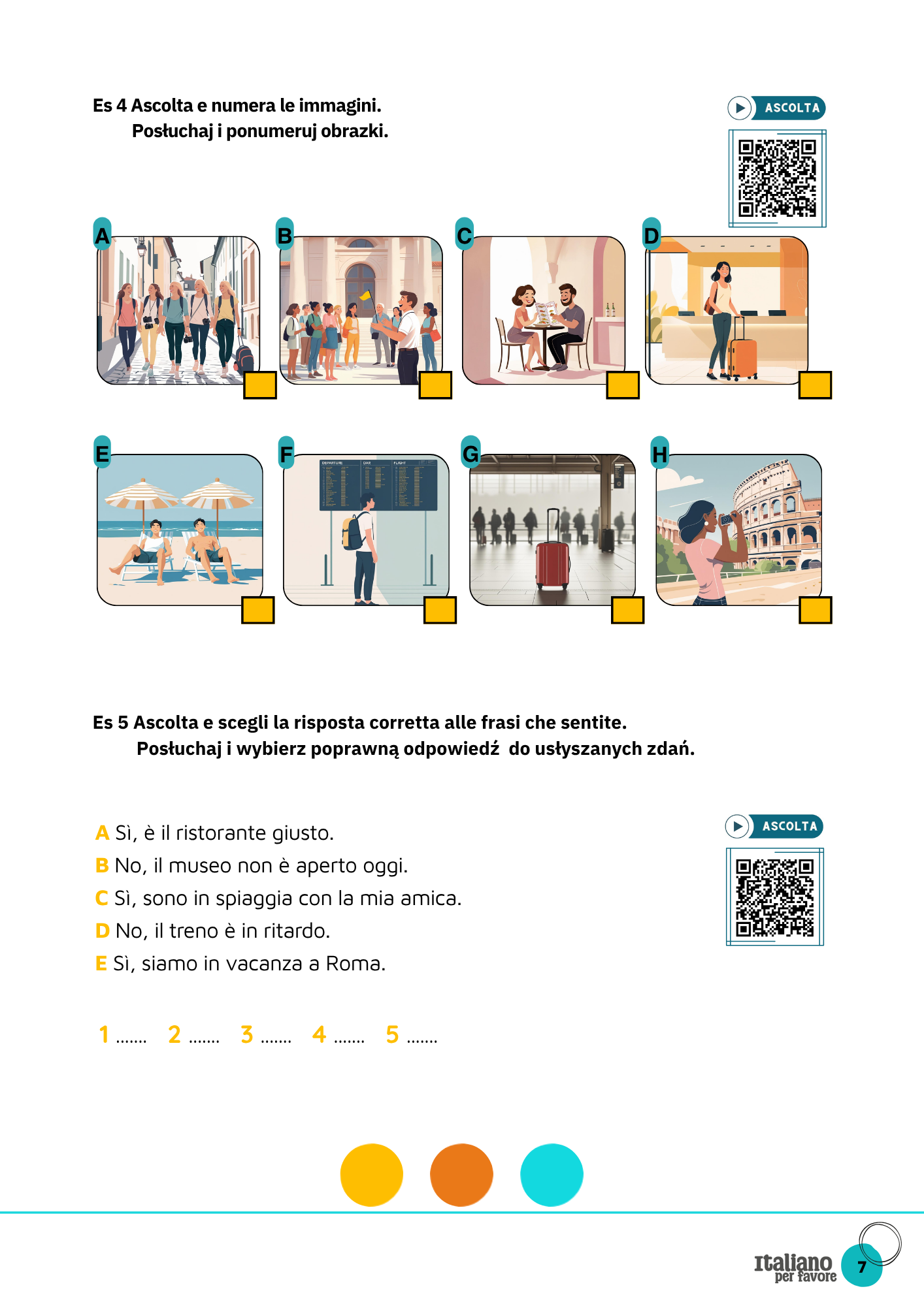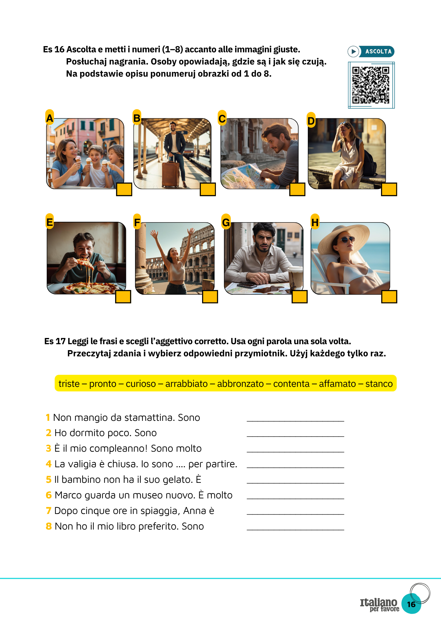 Dzięki temu workbookowi nauczysz się nie tylko odmiany, ale przede wszystkim praktycznego użycia czasownika „być” w kontekście turystycznym. Powiesz, kim jesteś, skąd pochodzisz, gdzie właśnie jesteś i jak się czujesz — wszystko podczas prawdziwych sytuacji w podróży: na plaży, w centrum Rzymu, w muzeum czy w hotelu.